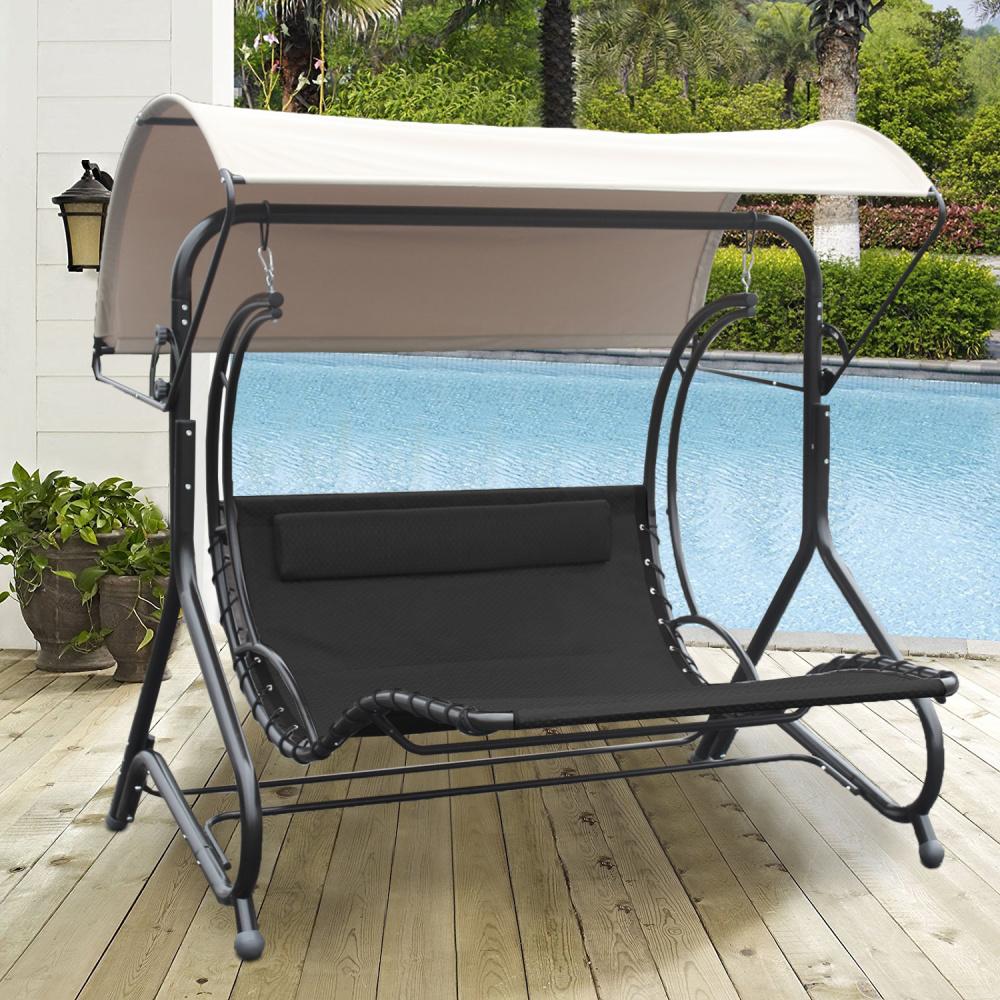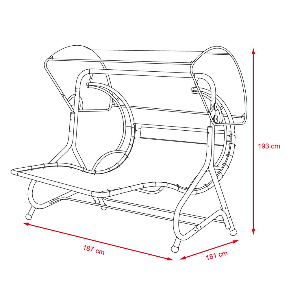 Profilovaná kovová konstrukce umožňuje vychutnat si houpání a velká ležící plocha je optimálně přizpůsobena tělu a nijak Vás neomezuje. Pohodlí odpočinku zvyšují opěrky hlavy a stříška, která chrání před nadměrným sluncem.