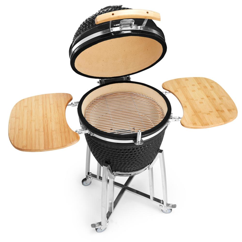 Exkluzivní vzhled, černá keramická glazovaná pec, robustní nerezová lesklá konstrukce, dřevěné sklopné bambusové bočnice, robustní pojezdová kola s brzdou.