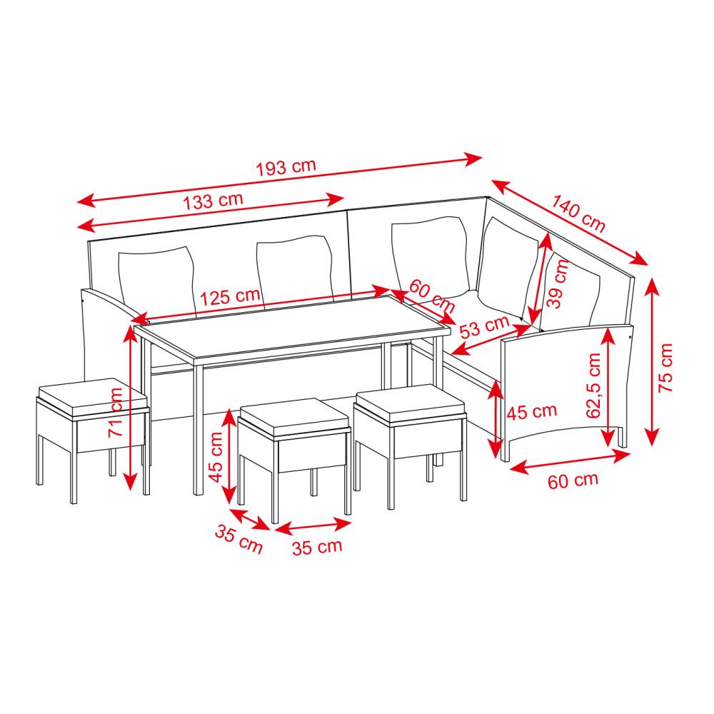 Rohová ratanová sedací souprava s jídelním stolem a 3 taburetkami |