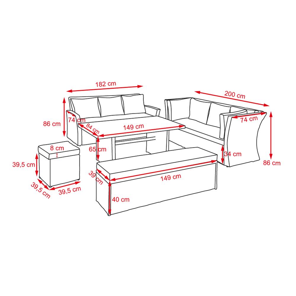 Významným prvkem této sestavy je její prostornost, je dostatečně komfortní pro pohodlné využití až 9 osob. Dále pak její účelnost, výborně poslouží jako jídelní souprava, například při servírování oběda nebo večeře na terase, ale také jako prostor pro relaxaci a odpočinek po těžkém dni.
