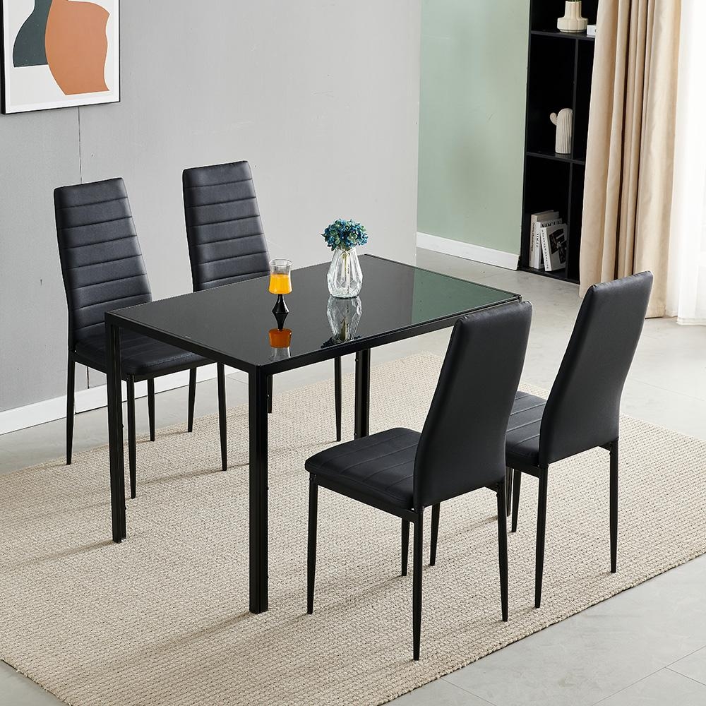 Set obsahuje stůl se skleněnou deskou a čtyři židle s pohodlným čalouněním z kvalitní syntetické eko-kůže. Sedáky jsou měkké a opěradla ergonomicky tvarovaná – ideální kombinace pro pohodlné snídaně i dlouhé večeře.