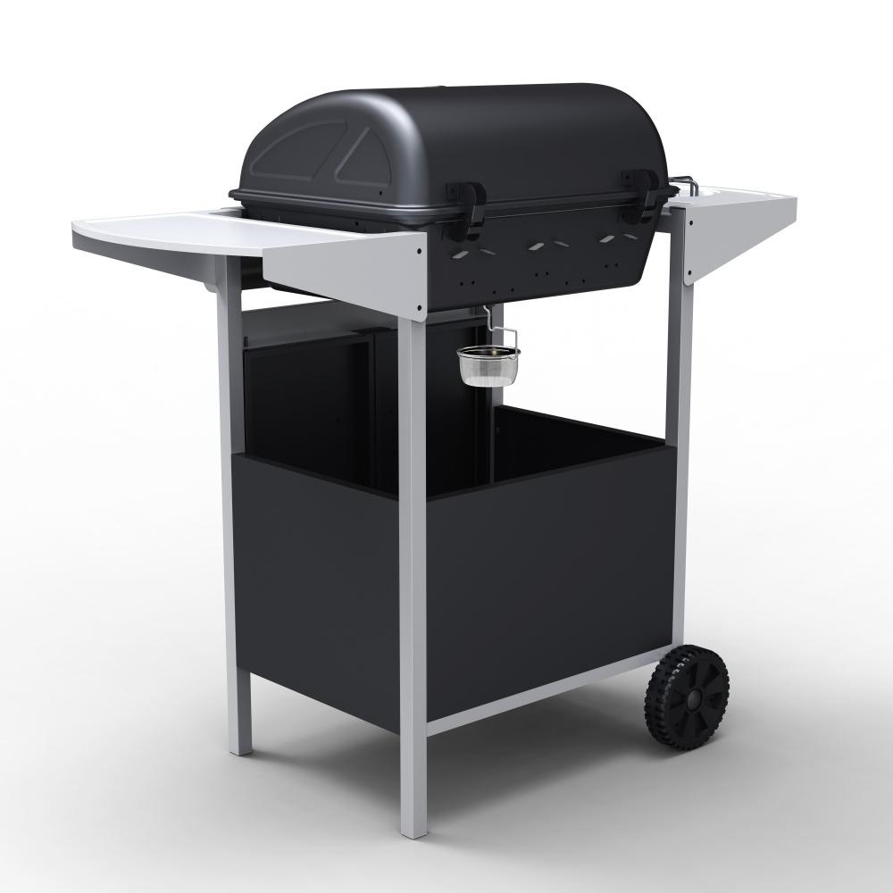 Ocelové víko s vestavěným teploměrem a nerezovým madlem dodává grilu luxusní vzhled, zatímco elegantní černo-stříbrné provedení je navrženo pro snadnou