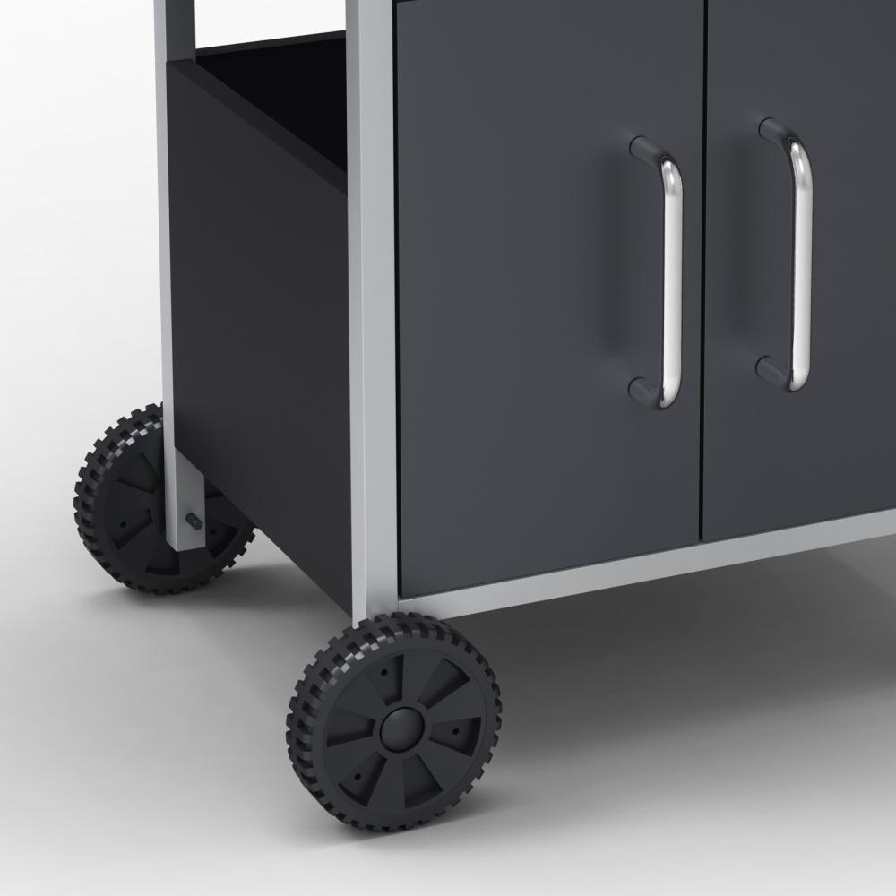 Velká pojezdová kolečka a praktický závěsný systém na grilovací nářadí. |