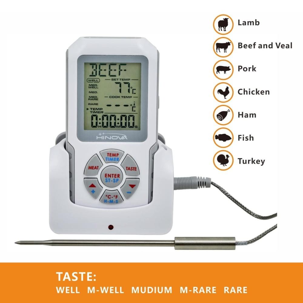 Digitální termosonda na potraviny umožňuje okamžité a naprosto přesné odečtení teploty pečeného masa . Obsahuje seznam ideálních teplot pro přípravu vašich jídel. Jednoduše si navolíte druh masa, požadovaný stupeň propečení a sledujete než teplota uvnitř masa dosáhne potřebnou teplotu, kterou vám teploměr doporučí. Termosonda je propojena se základnou .