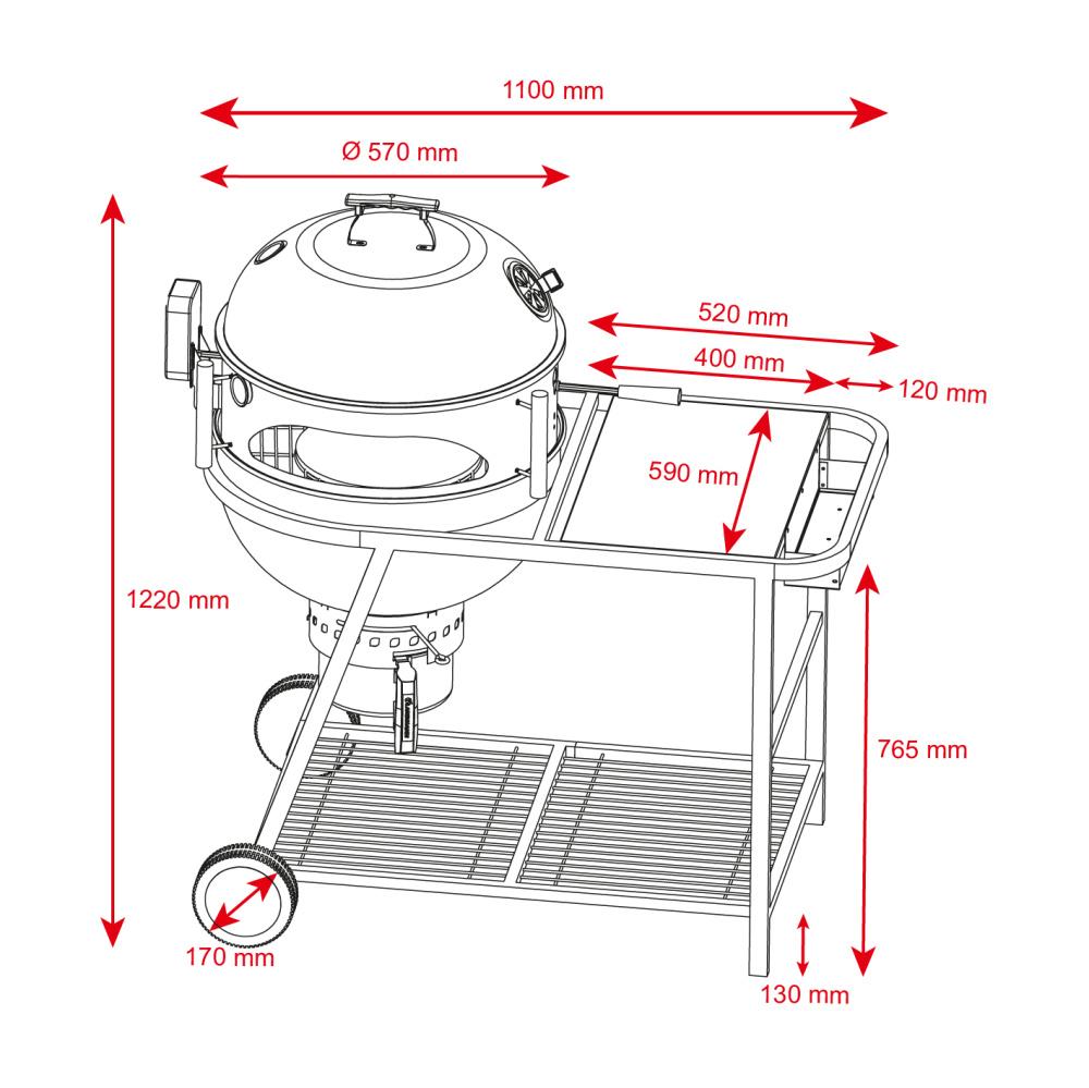 Konstrukce grilu vychází z robustního kotlového grilu o průměru 57 cm, se smaltovanou povrchovou úpravou zajištující velmi dobrou tepelnou odolnost, ale i dlouhou životnost. Tento je pak usazen do praktického vozíku na kolečkách poskytující dostatečnou pracovní plochu a prostor na odložení grilovacího nářadí či náčiní.