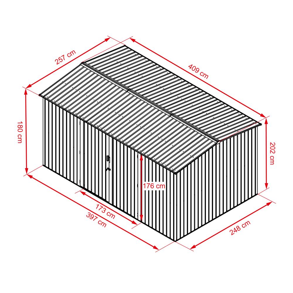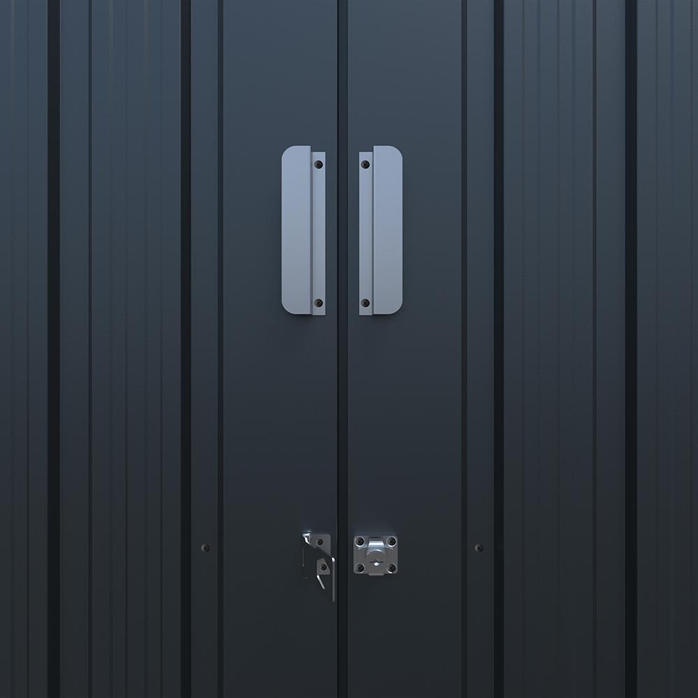 Výška dveří 1,8 metru. Kvalitnější materiál bočních stěn s min. tl. 0,3 mm, ošetřený práškovou barvou v antracitovém odstínu Žárově zinkovaný rám a konstrukce domku. Možnost lepšího uzamčení domku.
