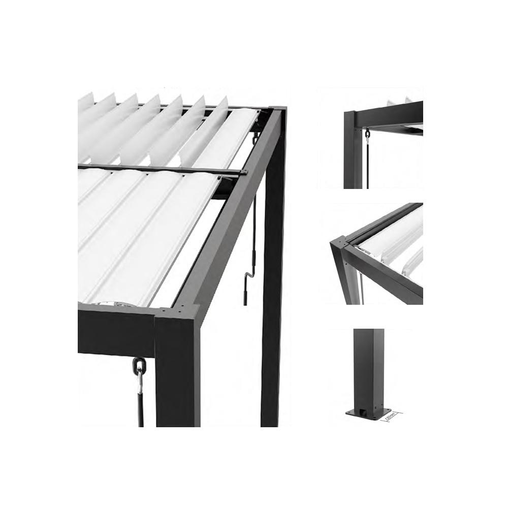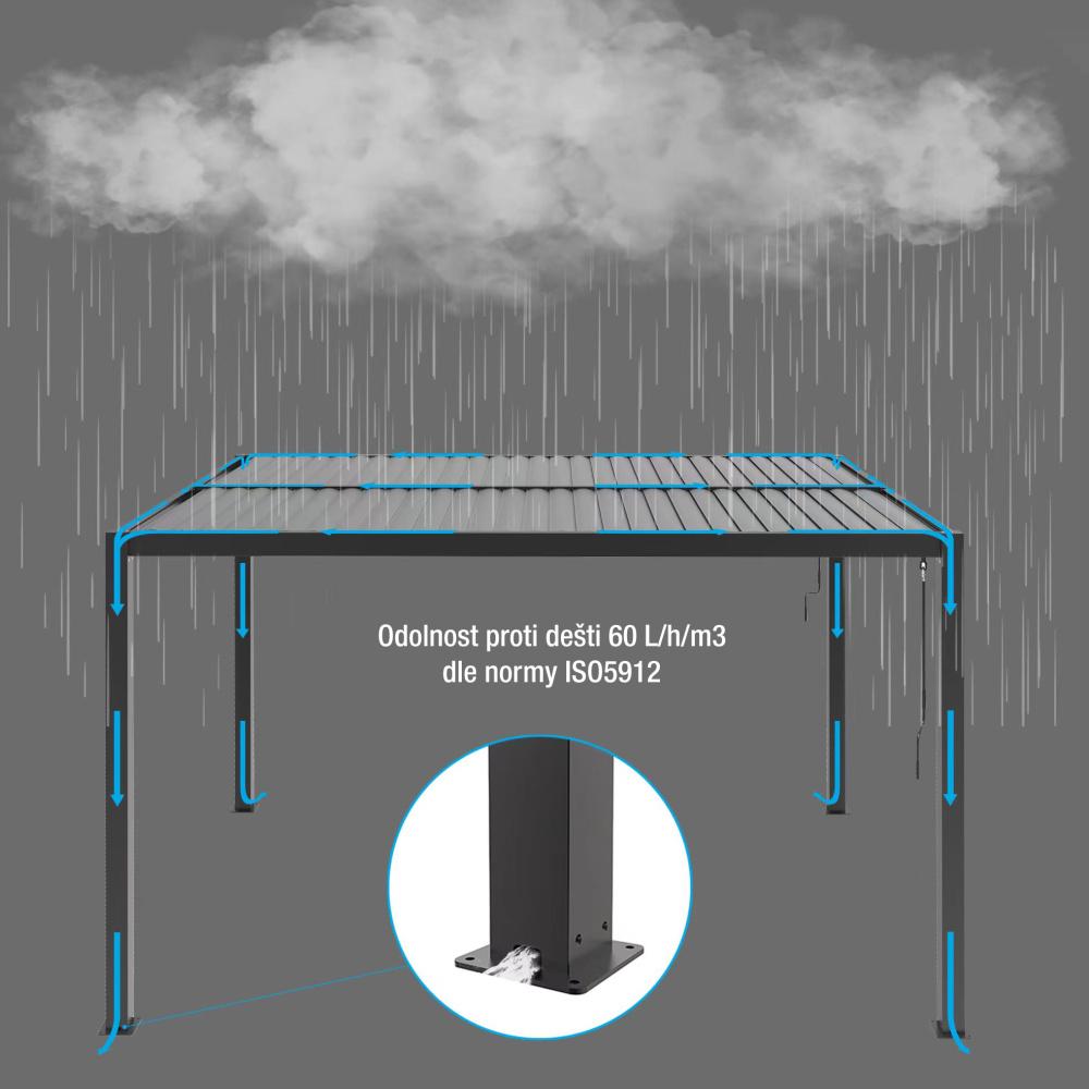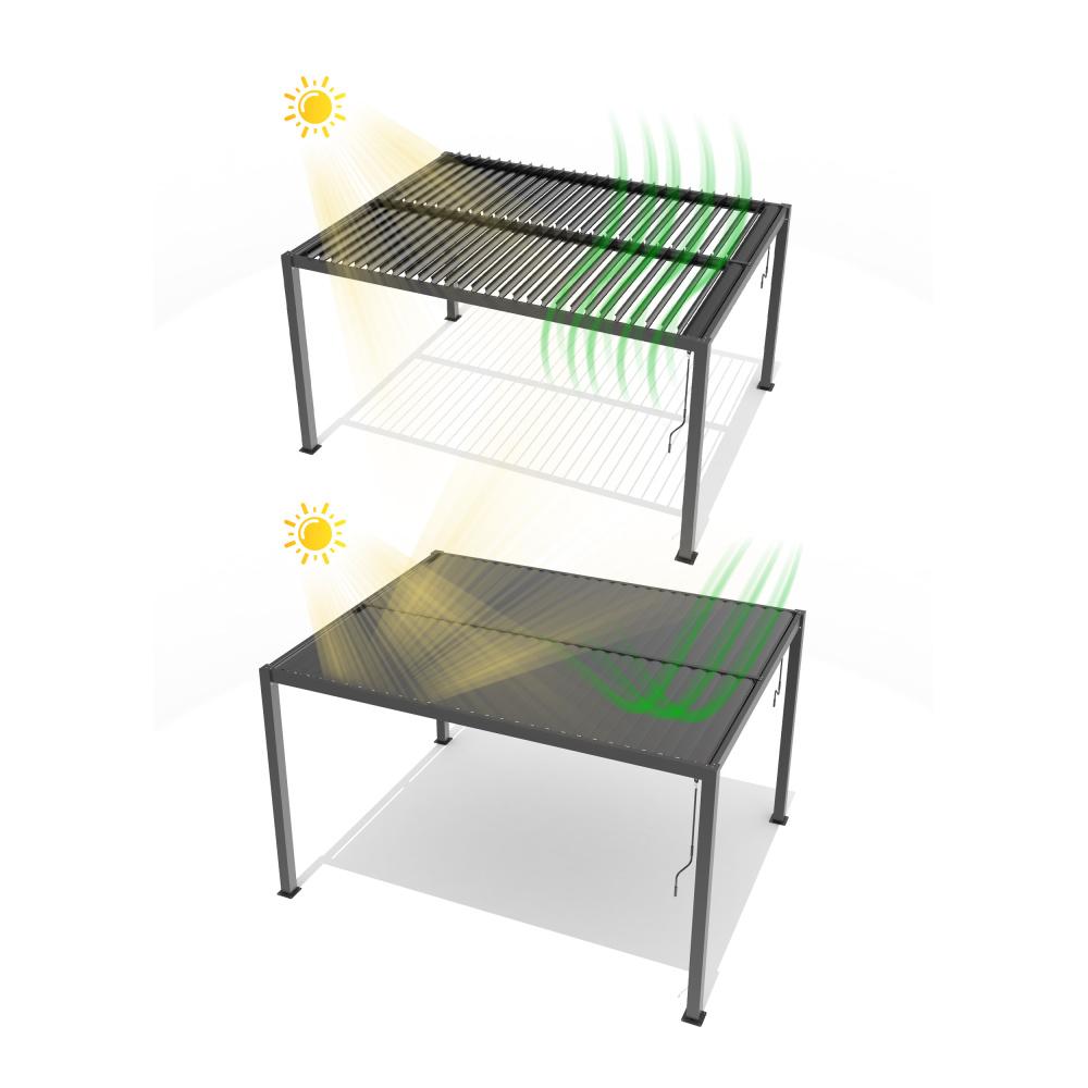 Bioklimatická pergola s lamelami je vyrobena z kvalitního hliníku, což zajišťuje dlouhou životnost a minimální údržbu. Pomocí závěsné kliky můžete snadno upravit natočení lamel a regulovat množství světla a vzduchu, které do pergoly proniká. Toto inteligentní řešení vám umožní vytvořit optimální mikroklima podle aktuálního počasí a vašich potřeb.