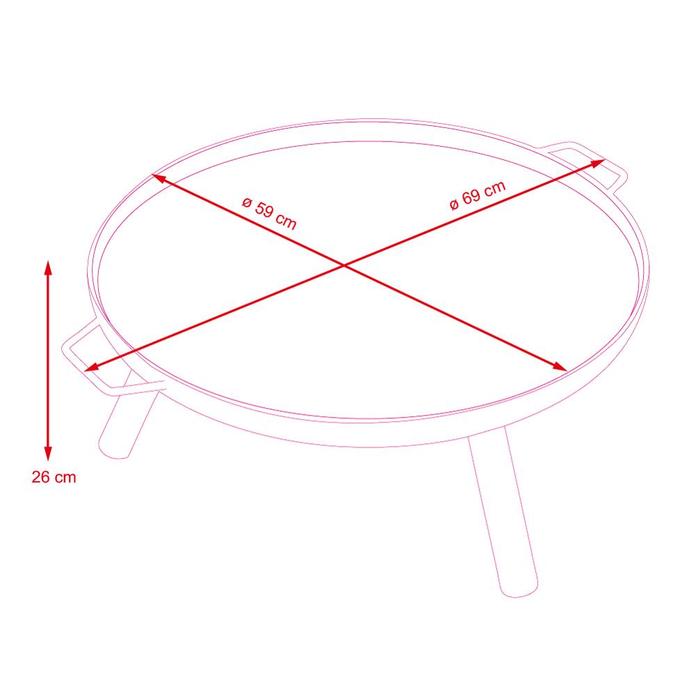 Vysoko umístěná mísa umožňuje použití ohniště na jakémkoli povrchu bez obav z poškození. Jeho praktický konkávní tvar umožňuje ohni hořet i při větru a díky třem masivním nohám je ohniště vysoce stabilní. Samotná konstrukce ohniště je vysoce stabilní a pevná. Průměr ohniště 590 mm, výška 260 mm.