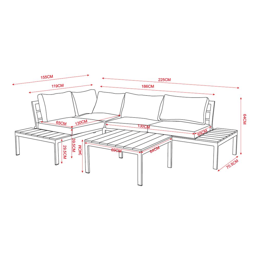 Rohový set zahradního nábytku v moderním designu obsahuje komfortní rohovou pohovku s měkkými polštáři, boční odkládací plochy a stolek. Stabilní kovovou konstrukci doplňuje odolná imitace dřeva, nábytek je tak praktický pro jeho snadnou údržbu. Skvěle vynikne v zahradě i na moderní terase.
