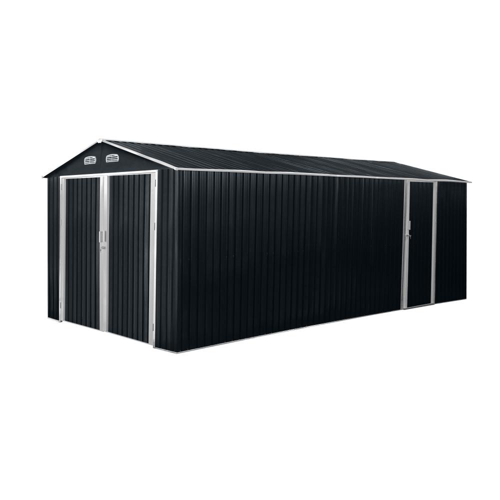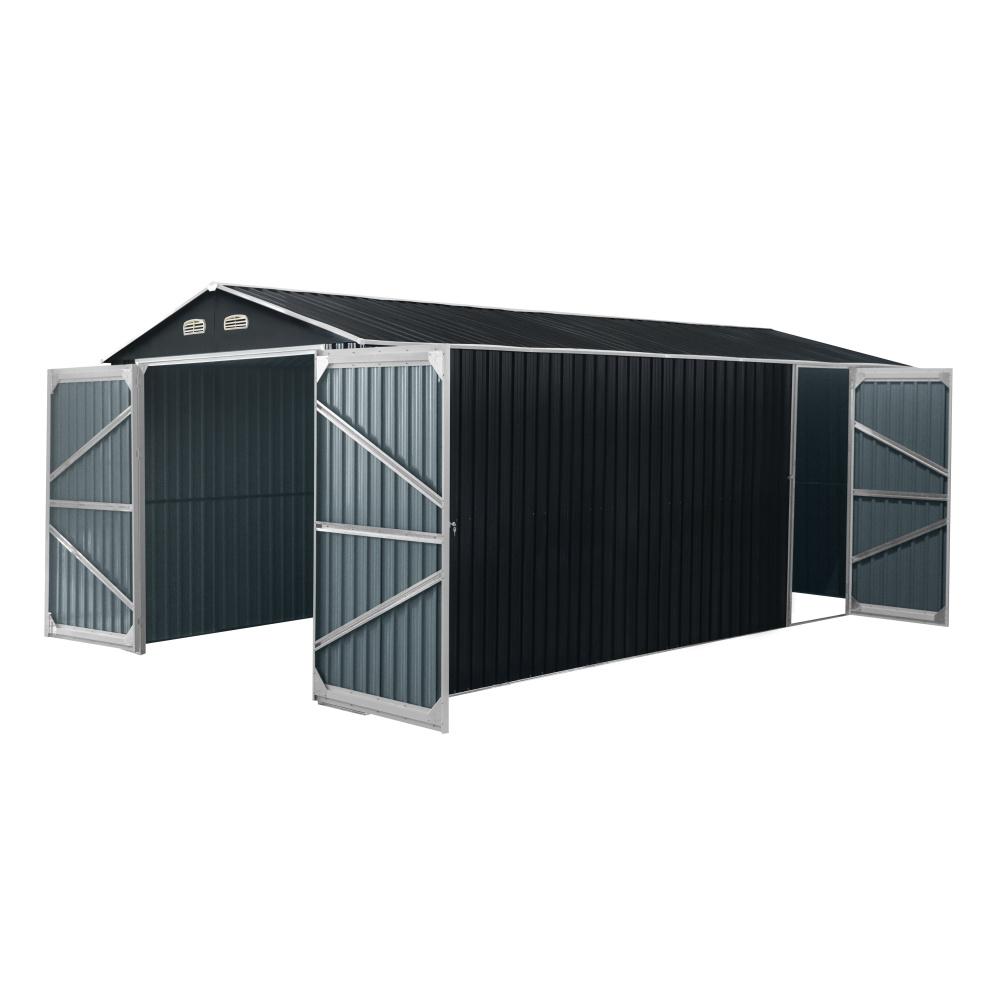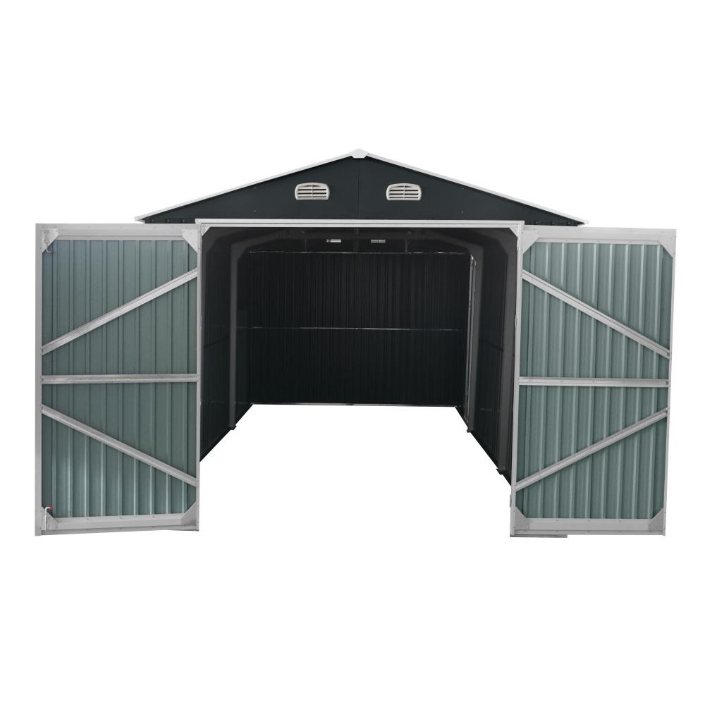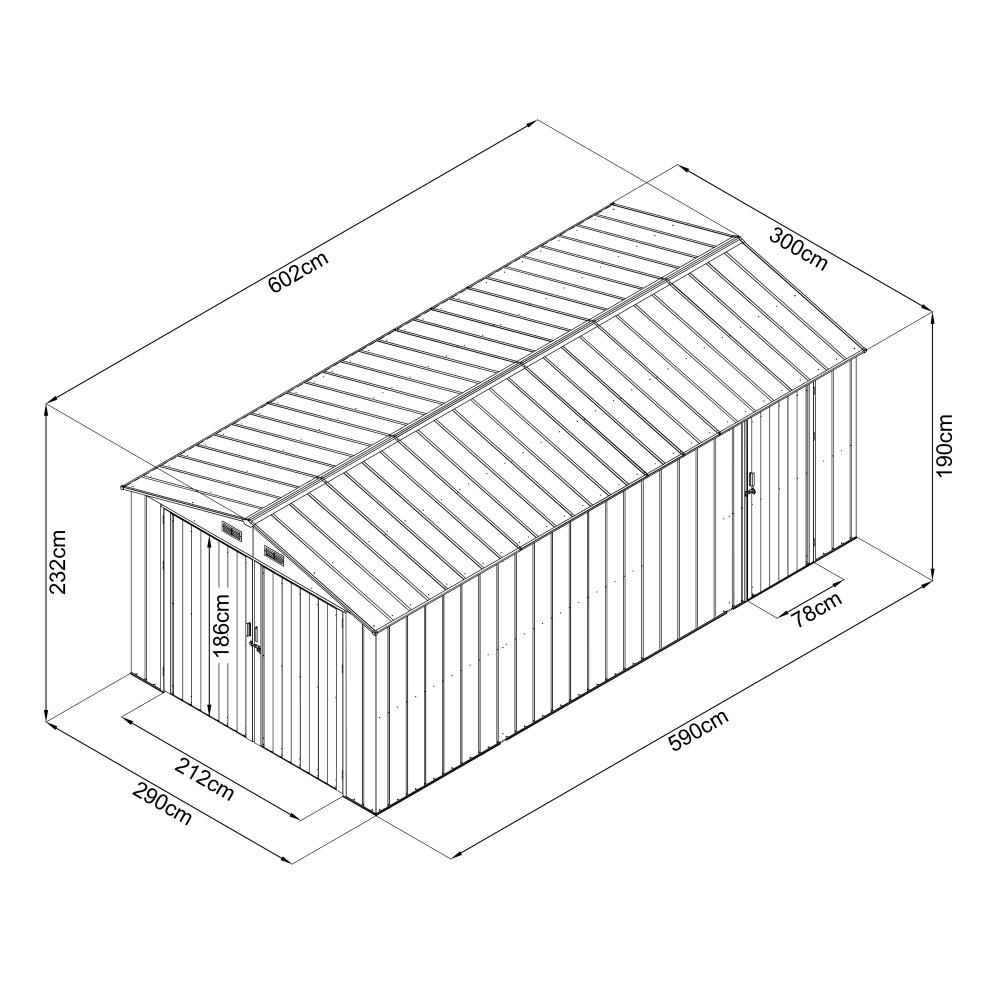 Kovový zahradní domek, garáž o rozměrech 602×300 cm je vyrobený z profilovaného plechu a se sílou stěny 0,3 mm. Zastavěná plocha domku je 17,11 m2. Boční zabudované dveře poskytují komfort bočního východu z domku. Čelní dvoukřídlá vrata o rozměru 212 x 186 cm jsou dostatečně velká i pro větší automobily typu SUV.