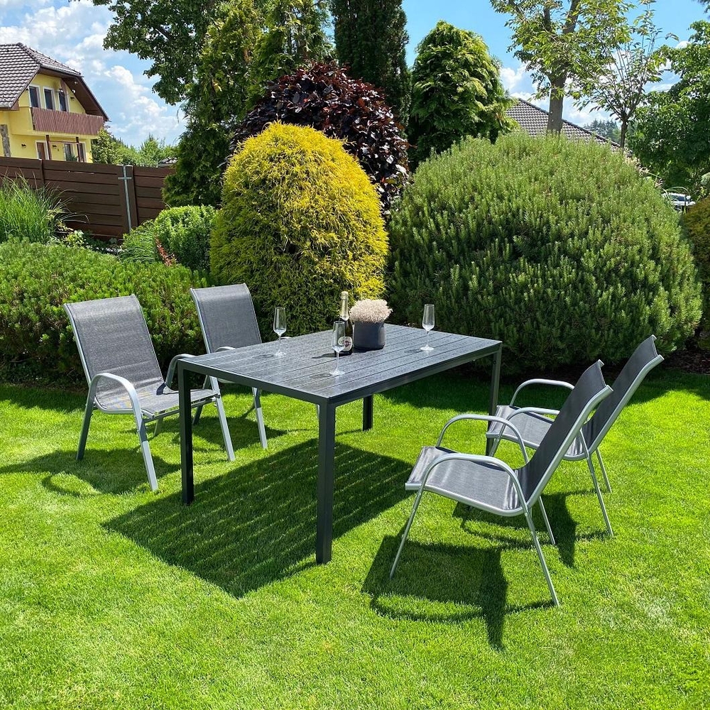Zahradní set VIKING L + RAMADA/ALINA se skládá z velkého stolu a čtyř kovových stohovatelných židlí.