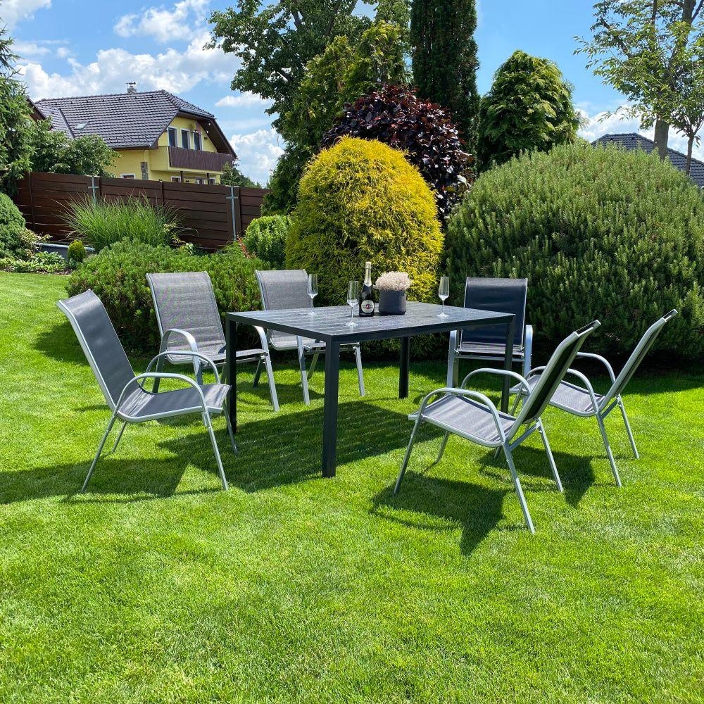 Zahradní set VIKING L + RAMADA/ALINA se skládá z velkého stolu a šest kovových stohovatelných židlí.