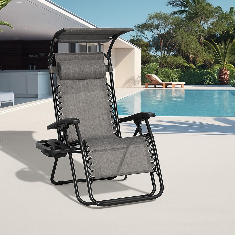 Raz, dva, tři a odpočinku už nic nebrání! Pohodlné polohovatelné křeslo PALMAS v šedém provedení se sluneční clonou už na vás čeká. Stačí se jen uvelebit