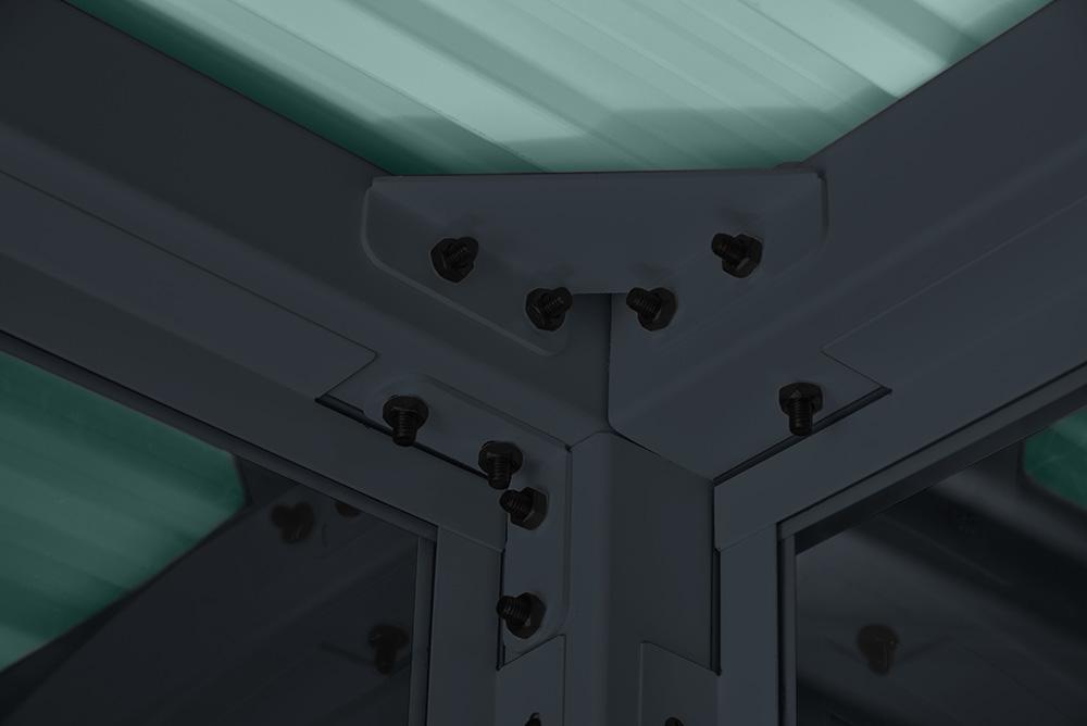 Robustní konstrukce z pozinkovaného ocelového panelového plechu a ocelových trubek, doplněná pevnými PC deskami pro dostatek světla uvnitř.