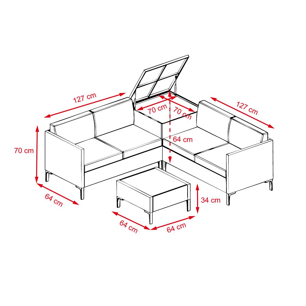 | Praktické řešení: Rohový díl se skrytým úložným prostorem pro polštáře, deky nebo časopisy. | |