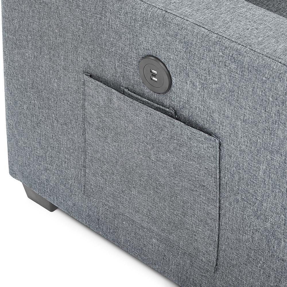 USB port a úložná kapsa v levé opěrce – nabij mobil nebo tablet rovnou z gauče |