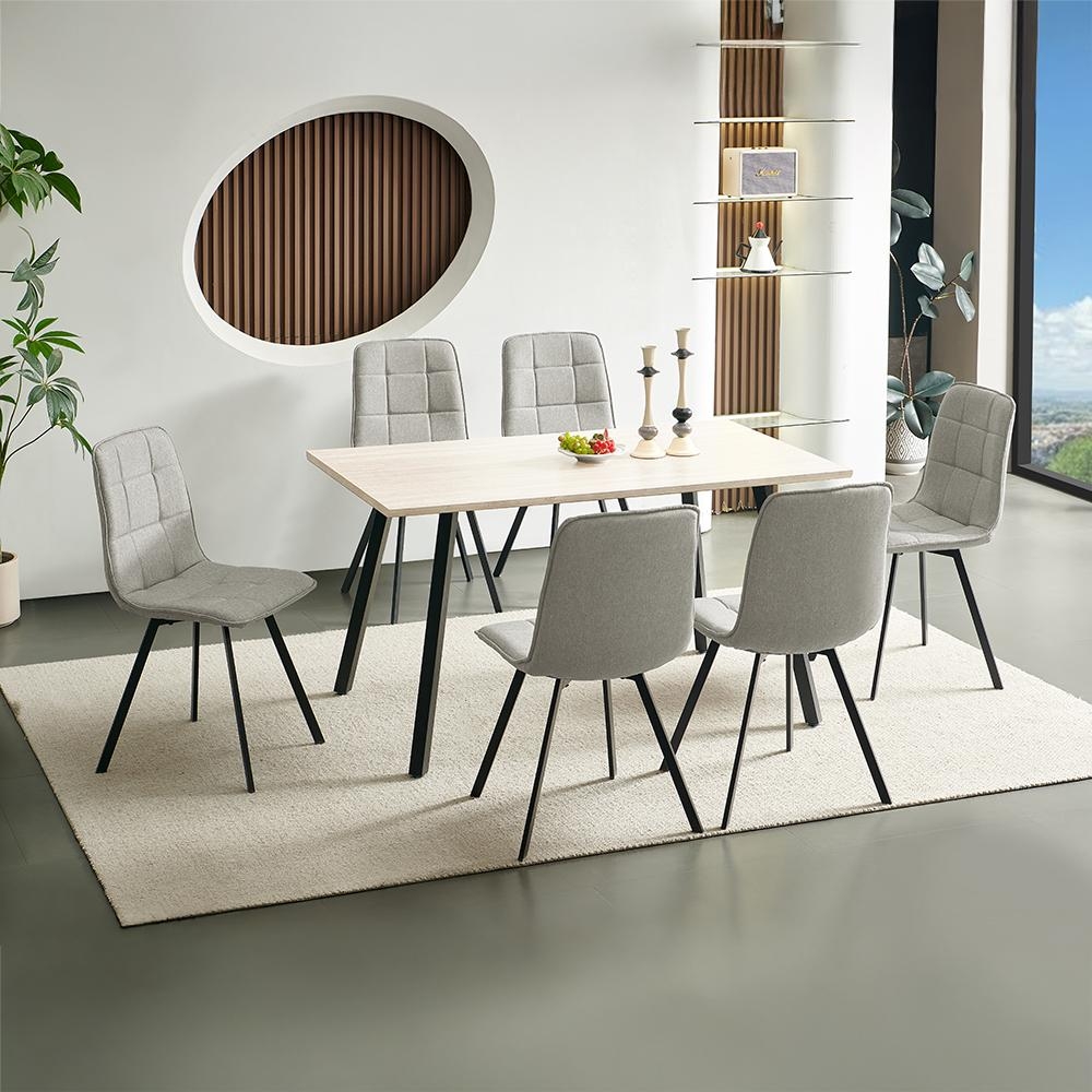 Židle jsou potažené světle šedou látkou a mají pohodlný sedák i vysokou opěrku zad s elegantním prošitím. Černé kovové nohy ladí se stolem a dodávají celé sestavě designovou jednotu.