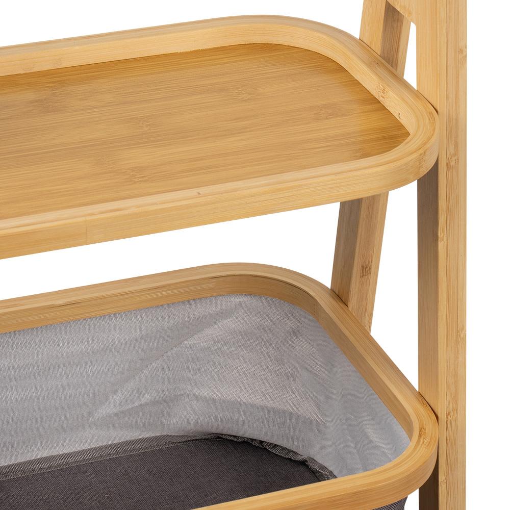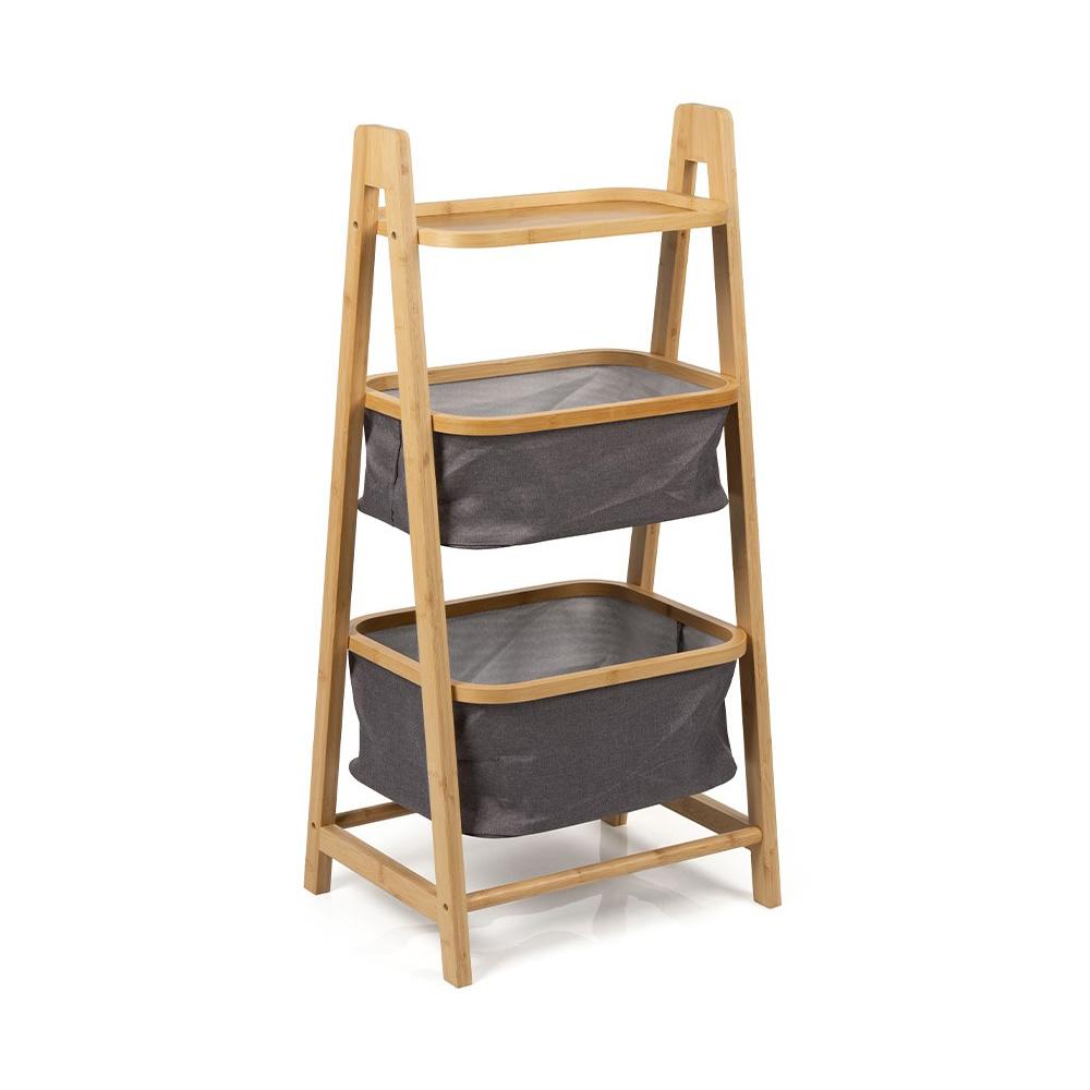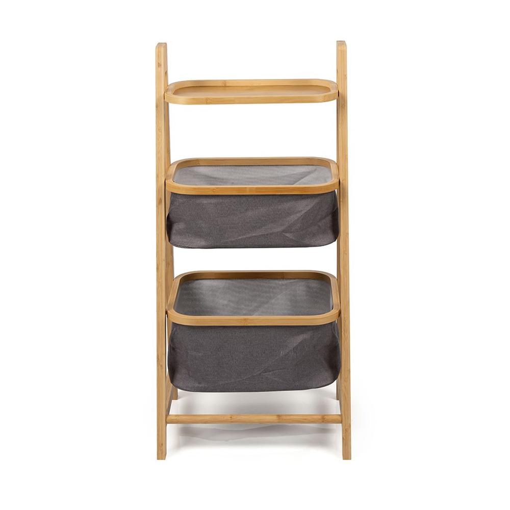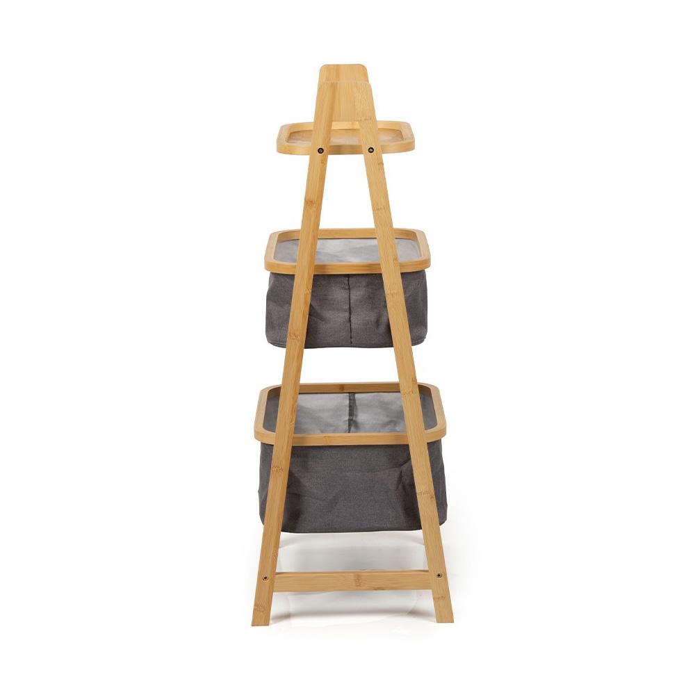 přírodního bambusu – pevná, stabilní a zároveň lehká. Šedé košíky působí čistě a moderně, takže regál zapadne do koupelny, ložnice, dětského pokoje i předsíně. A klidně i do kuchyně, pokud potřebujete další úložné místo na drobnosti.
