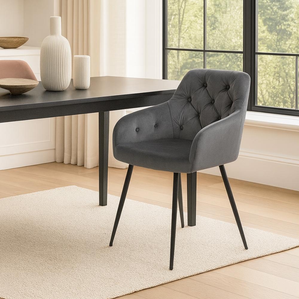 Sametové křesílko k jídelnímu stolu, které působí elegantně a nabídne pohodlí na dlouhé posezení.