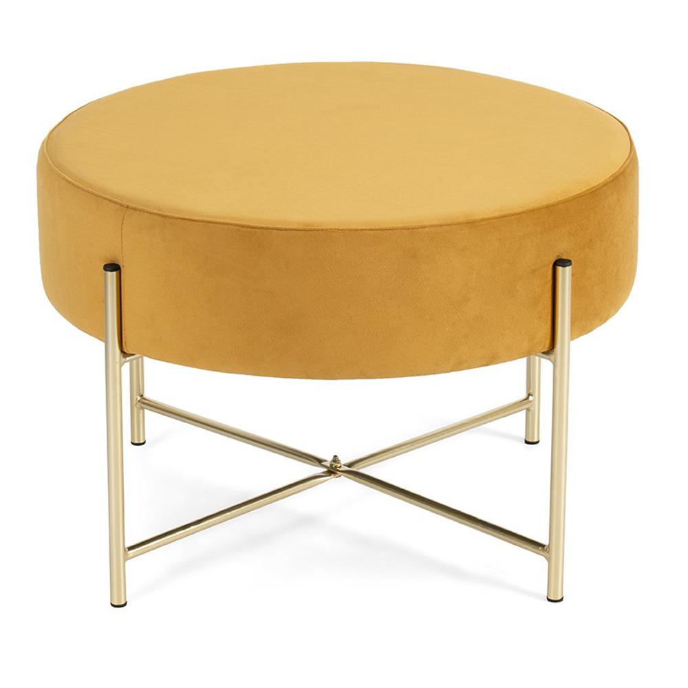 Kulatý taburet v hořčicově žluté barvě vnese do interiéru šmrnc a nádech luxusu.