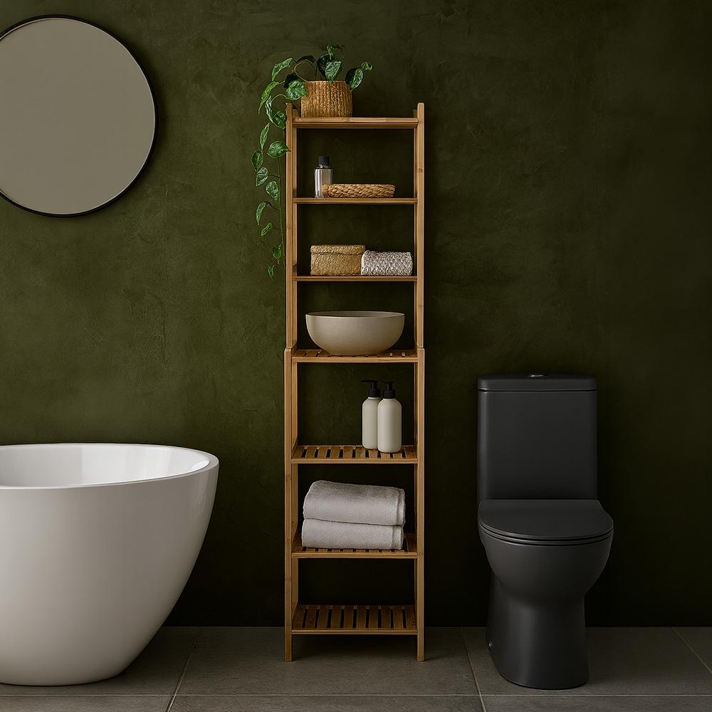 Dvouúrovňový bambusový regál se sedmi policemi je praktické úložné řešení do koupelny, kuchyně i předsíně. Díky štíhlému provedení se vejde i do užších koutů, přitom nabídne spoustu místa na ručníky, kosmetiku, košíky nebo čisticí prostředky. Přírodní bambus dodá interiéru teplý vzhled a