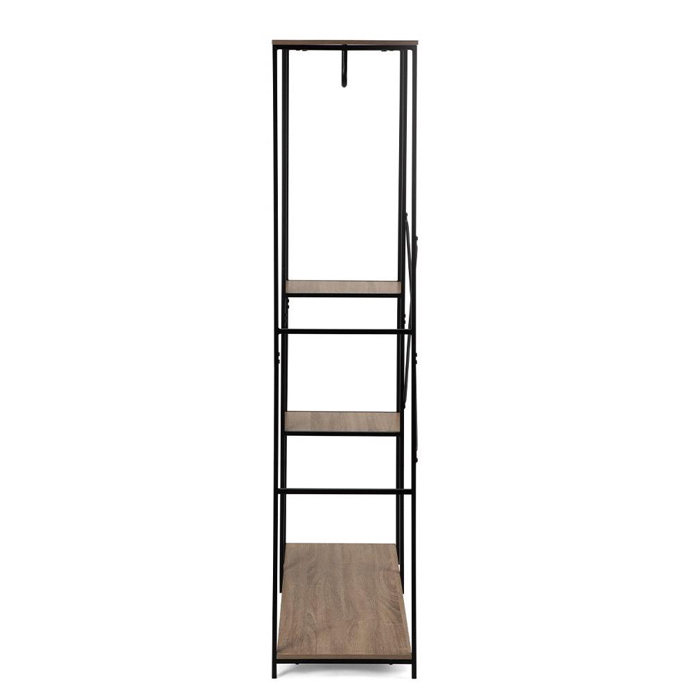 dřevěné/překližkové police v přírodním dekoru. Díky tomu působí lehce, ale zároveň pevně a stabilně. Horní tyč využijete pro ramínka s kabáty, boční police jsou ideální na boty, tašky nebo úložné boxy – a spodní část poslouží jako další odkládací plocha.