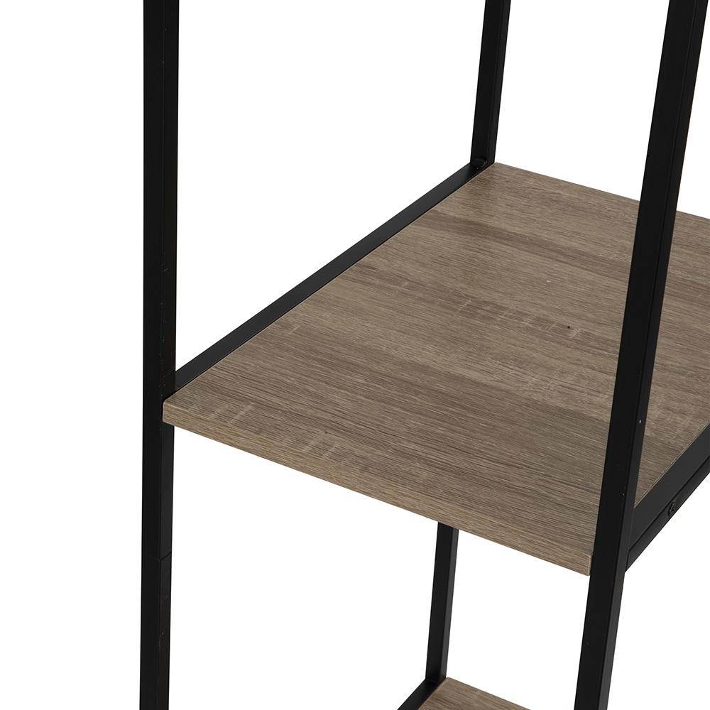 boční police na boty, krabice nebo doplňky a spodní plochu pro odkládání. Černý kovový rám s práškovým nástřikem působí moderně a stabilně, zatímco police v přírodní barvě dodají interiéru teplejší vzhled.