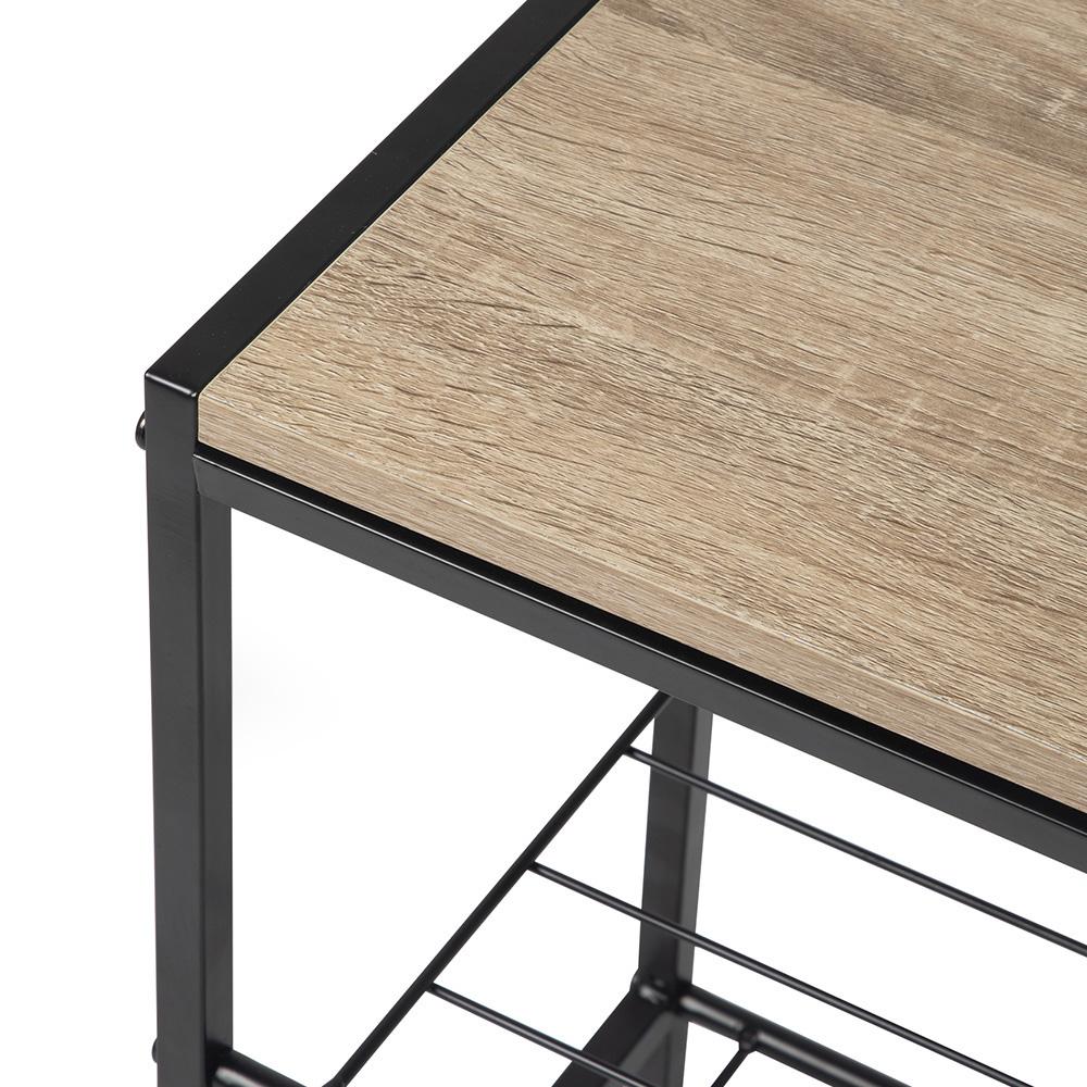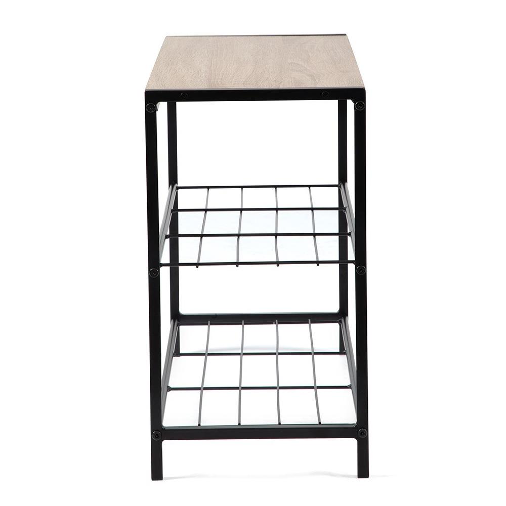 Lehký kovový botník se dvěma drátěnými policemi a dřevěným dekorem nahoře – praktický pořádek i odkládací místo v jednom.