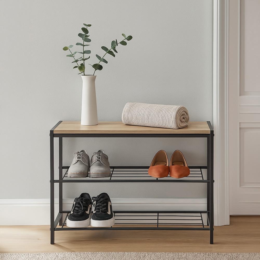 Botník s ocelovou konstrukcí je ideální do předsíně, chodby nebo šatny, kde chcete mít obuv přehledně uloženou a zároveň využít horní desku na odložení klíčů, kabelky nebo drobností.