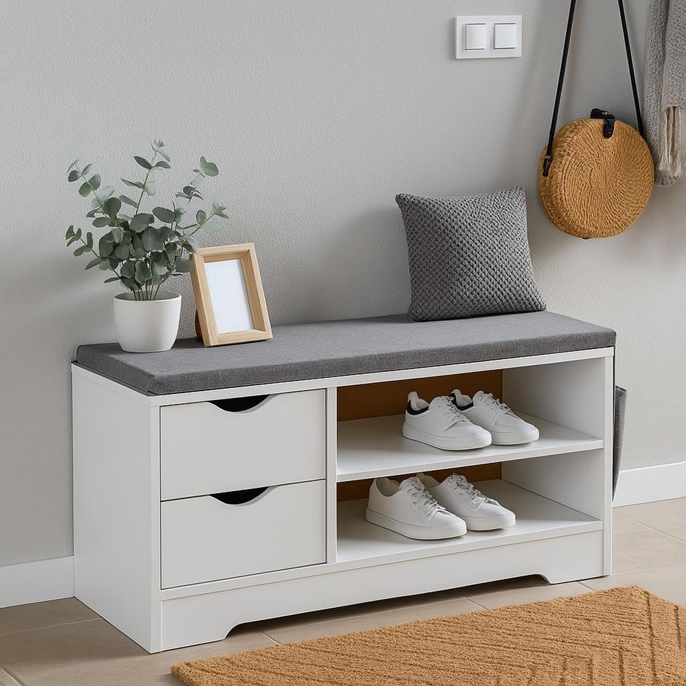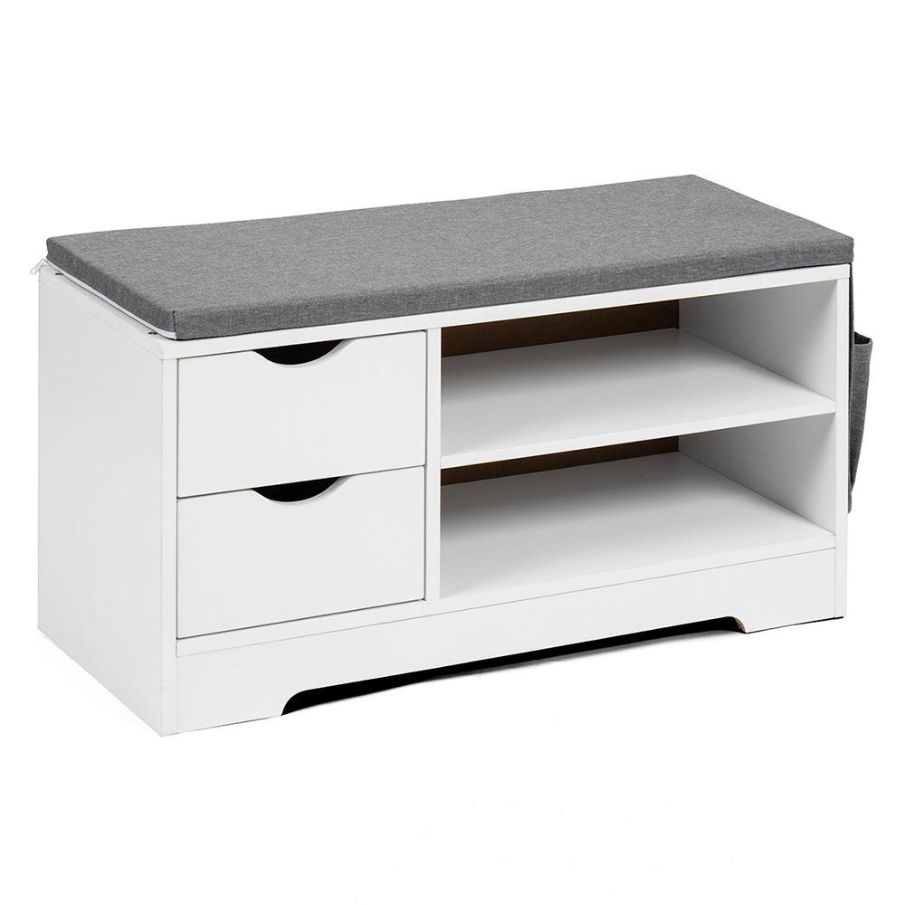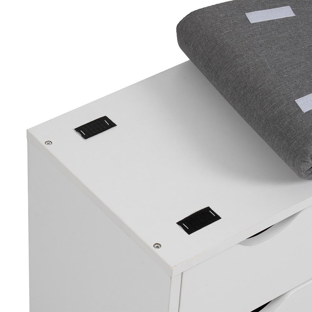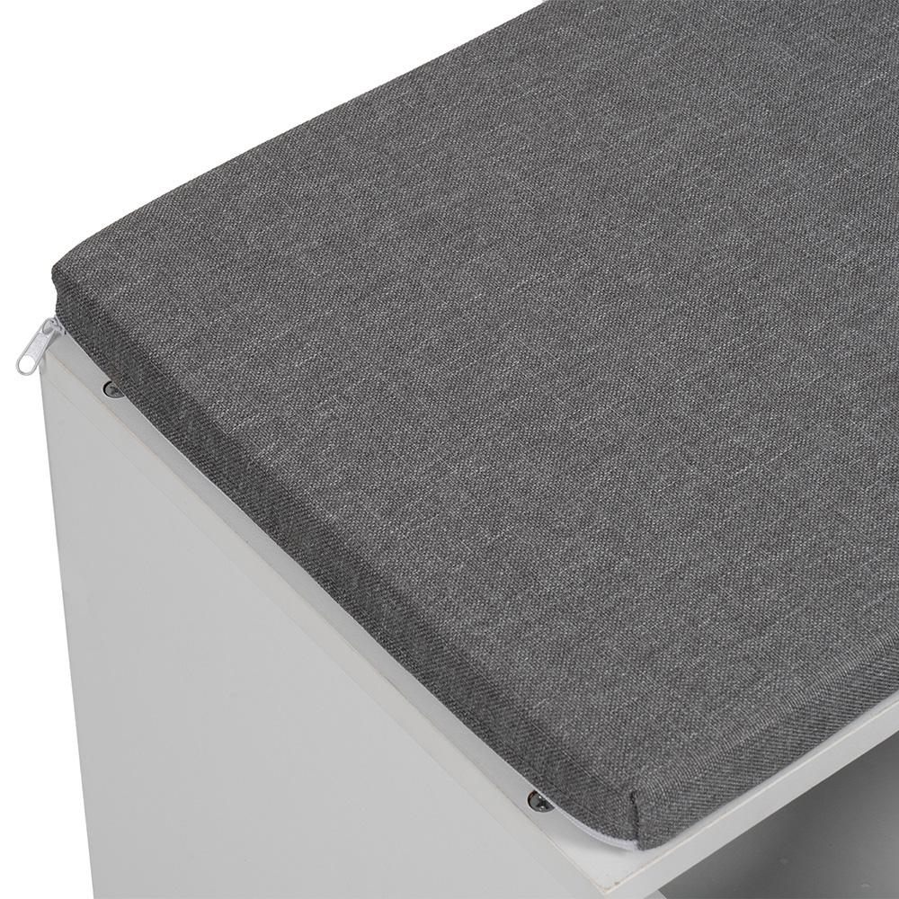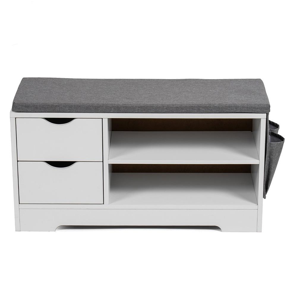 otevřené police na obuv, které budete mít hned po ruce. Šedý látkový sedák z pěny působí útulně a zároveň se snadno kombinuje s ostatním nábytkem.