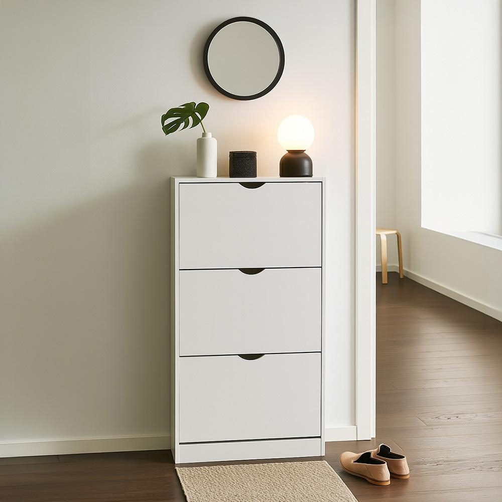 třem výklopným přihrádkám budete mít obuv přehledně uloženou a zároveň schovanou, aby předsíň působila čistě a upraveně. Úzká hloubka a minimalistický design z něj dělají perfektní volbu do moderních i skandinávských interiérů.