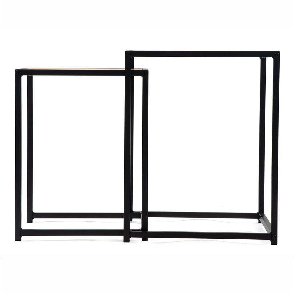 černou ocelovou konstrukcí. Díky dvěma velikostem je můžete používat vedle sebe, zvlášť, nebo menší zasunout pod větší a ušetřit místo. Ideální k sedačce, do čtecího koutku i menšího bytu.