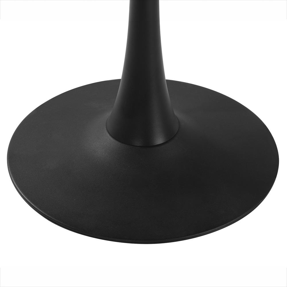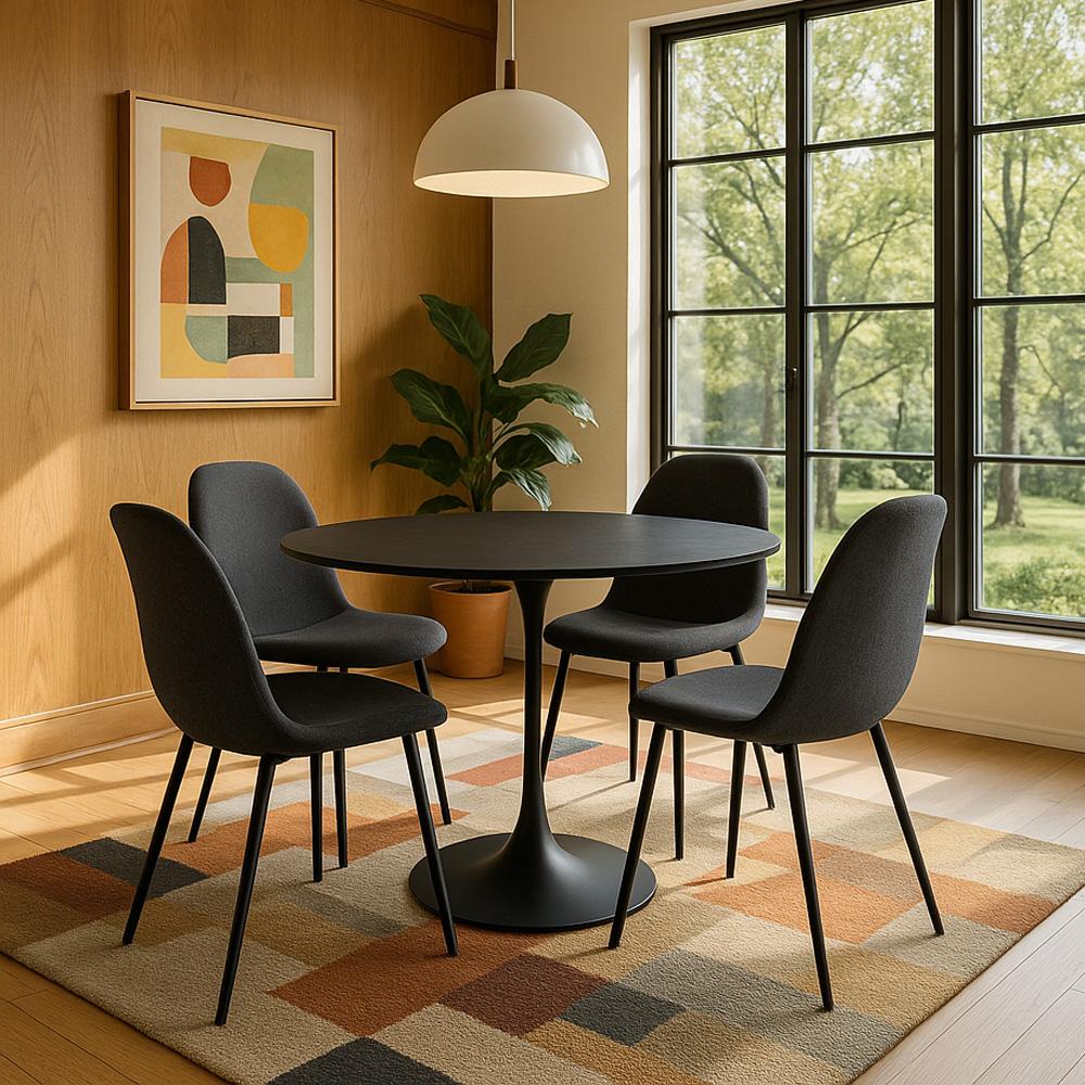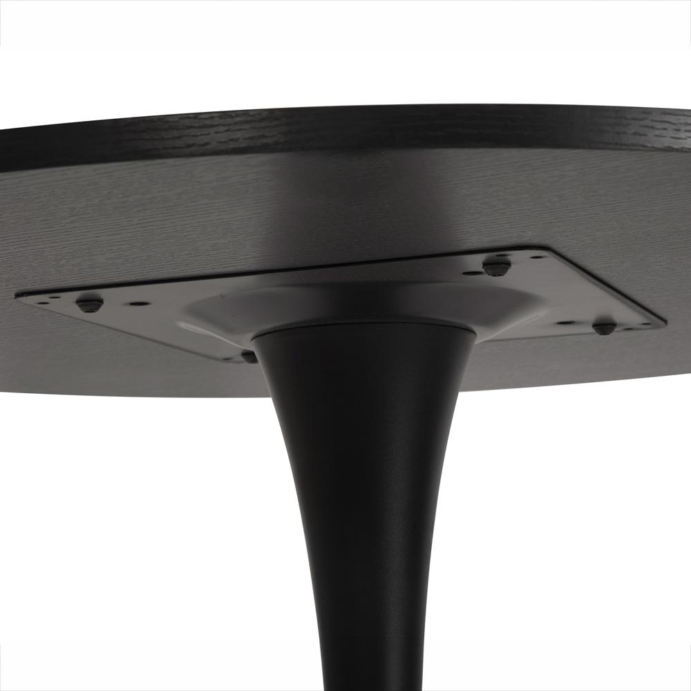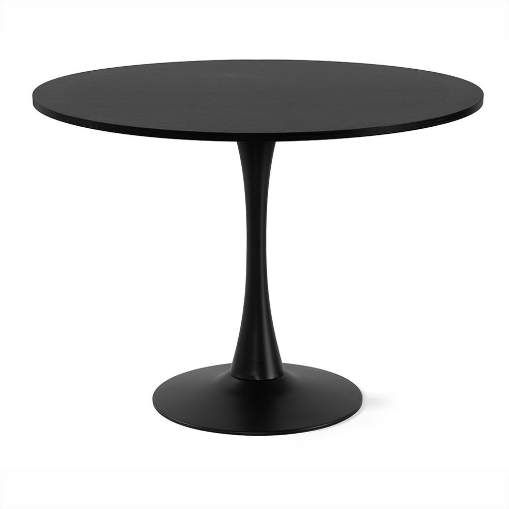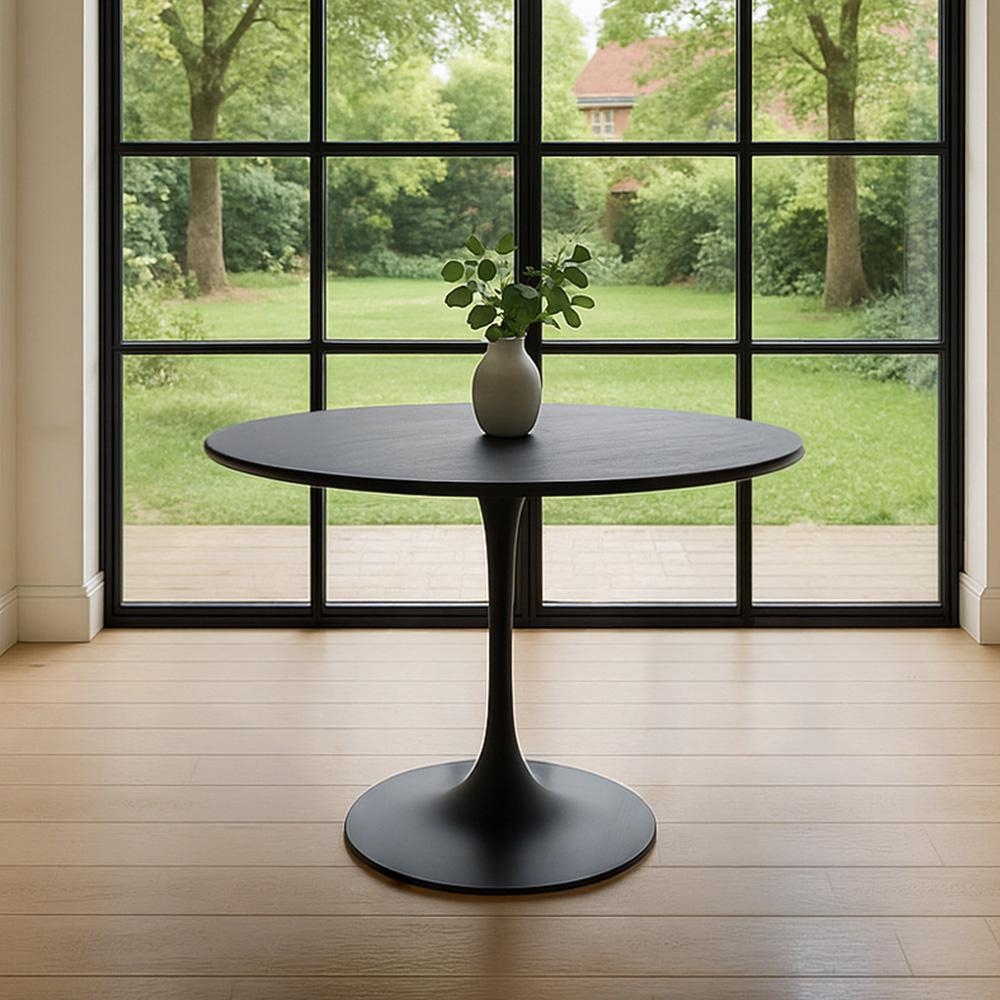 Kulatý jídelní stůl v černé barvě s jemnou strukturou dřeva – stabilní centrální podnož a více prostoru pro pohodlné sezení.