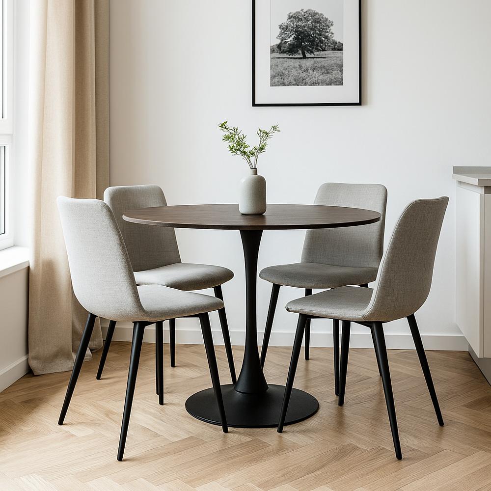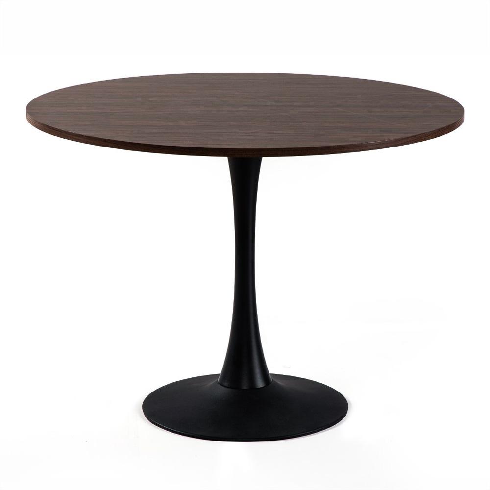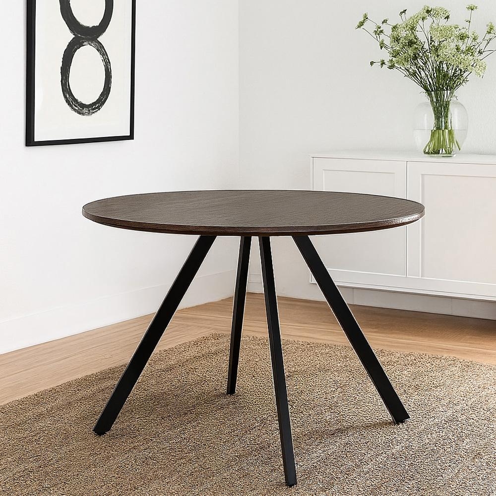 Prostorný kulatý jídelní stůl v tmavě hnědém dekoru dřeva s černou kovovou podnoží – výrazný prvek do moderní jídelny.