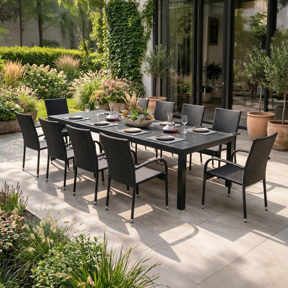 VIKING XXL + 10× PARIS je ideální, když chcete jeden velký stůl pro rodinné obědy, grilování i oslavy. Stůl VIKING XXL je