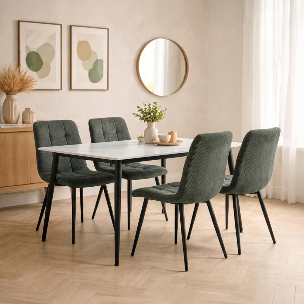 AVENBERG EMERALD – elegantní jídelní set s bílou keramickou deskou v mramorovém dekoru a olivově zelenými manšestrovými židlemi pro moderní, útulné stolování.