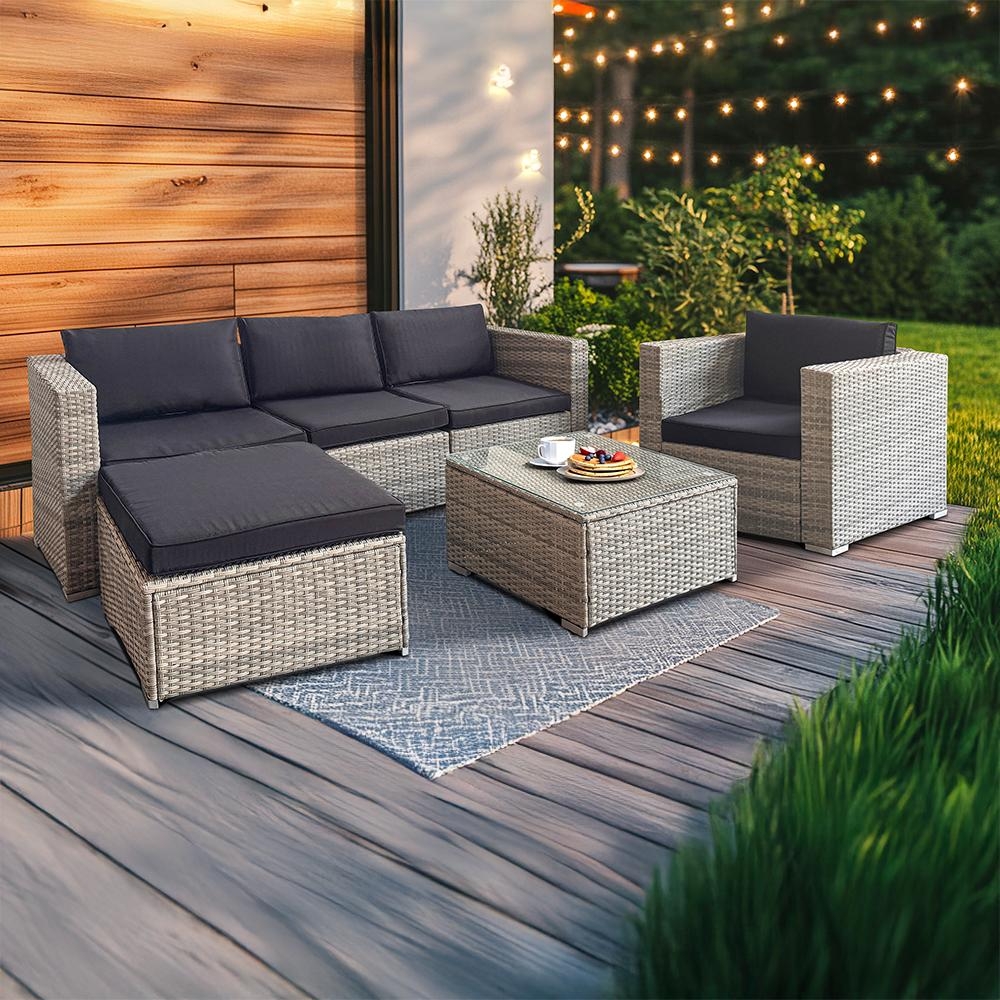 šedého PE ratanu a elegantních černých polstrů vypadá skvěle u domu, na terase,